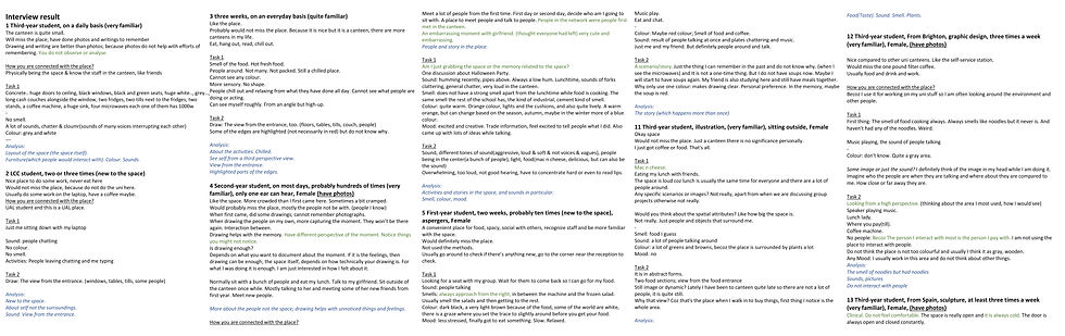Because of the limitation of time, I only conducted the research in one chosen space. I took the canteen of Camberwell College of Arts as an example, because for one, it is a typical shared space within colleges where students have different space-related memories. For another, it is a space in high-frequency use, and it contains multi-sensory experiences, which is more likely to shape rich memories.