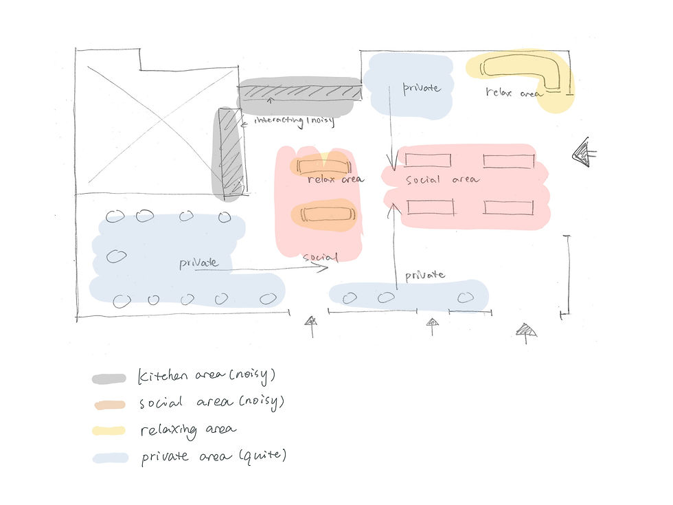 I did the observation during three states, including the crowded lunchtime, less crowded afternoons and quiet after-school time. I found that the space is not merely regarded as a canteen, but as a place for studying, socialising or killing time (see picture below). During busy hours, most people are heating food, eating or chatting in groups; During quiet hours, people are mainly studying, listening to music or waiting for friends alone (see picture below). Central areas are where social activities happen. While alongside the wall and windows, people are mostly sitting individually, either studying or eating. The space is quite noisy, and there is always the background noise of the pipes. But the warm lights from the ceilings bring much comfort.