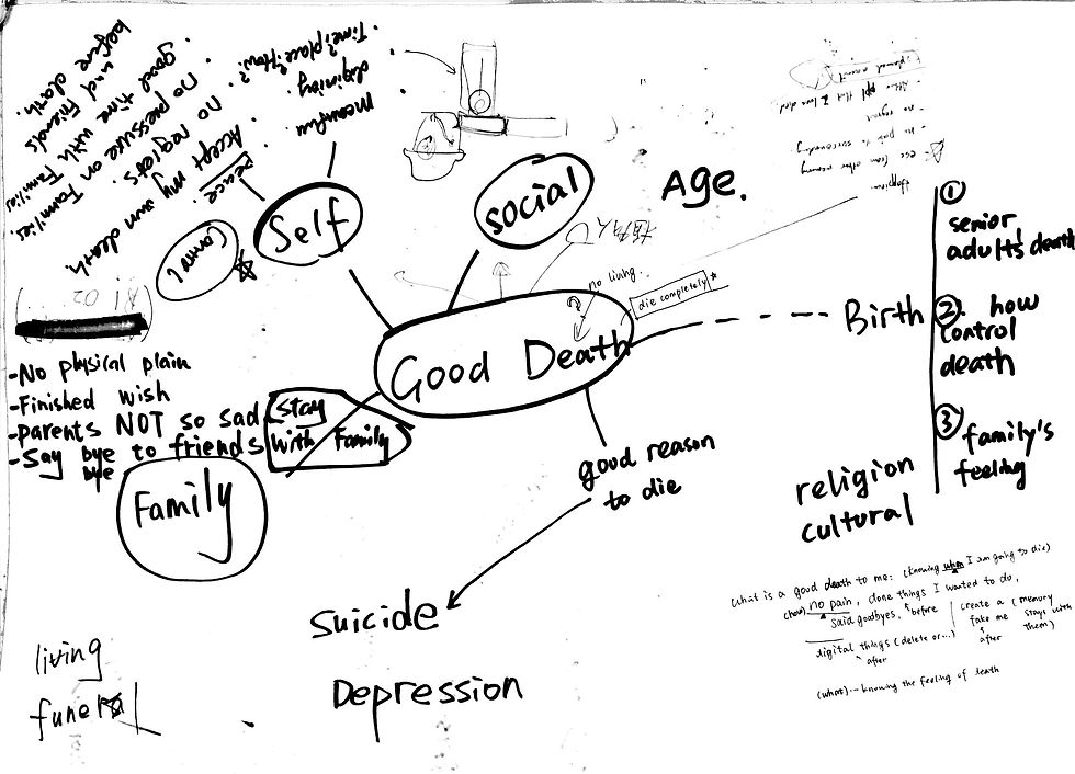Death has been a distant topic for us and we started the discussion soon after the class. We talked about what is a "good death" in our thoughts. I advised that we all wrote our thoughts on the paper, and what we found interesting was that almost everyone of us mentioned a word "control". To us, a good death should be a controllable process - we should know when and how we were about to die. Another keyword was family. We cared about family's feelings a lot during death.
