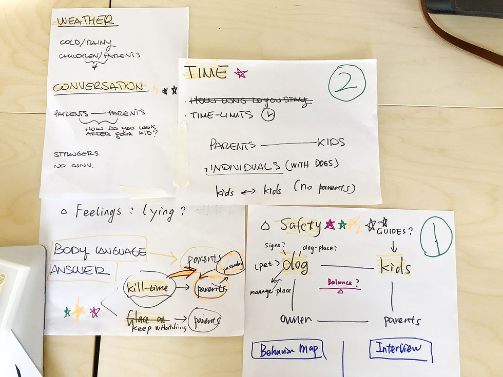 We decided on focusing on the relationship between the parents and the kids and listed out what could be design opportunities. Then we divided us into 2+3, for the "interview" method and "behaviour map" respectively. Jing Zhao, Dark and I worked together on the behaviour map. We also listed what we could do in this method, as the notes in the picture shown.